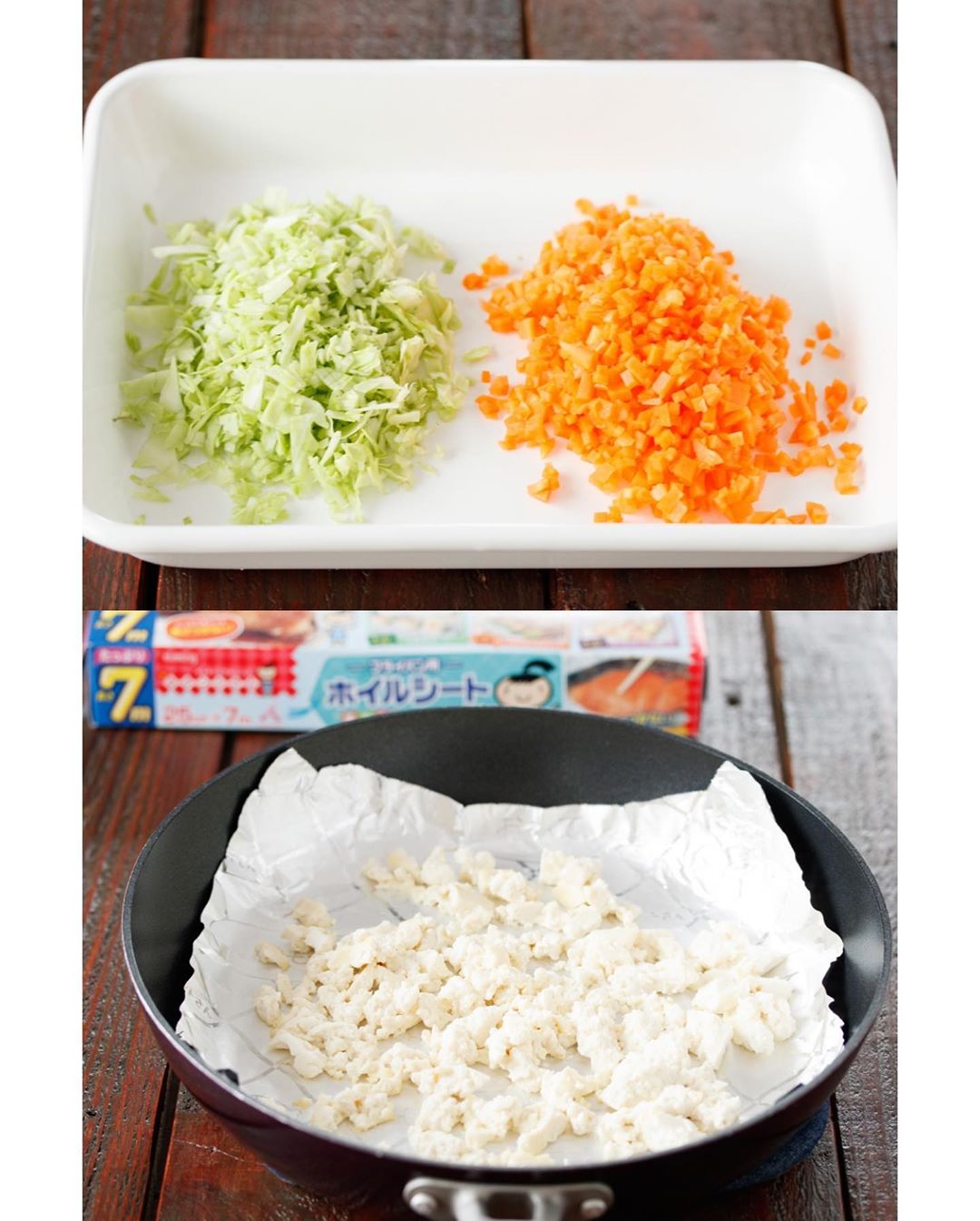 フライパンにキチントさんフライパン用ホイルシートを敷き、木綿豆腐をちぎって入れます。 強めの中火にかけ、水分を飛ばすように炒めます。ポロポロになったら一旦ホイルシートごと器に取り出します。