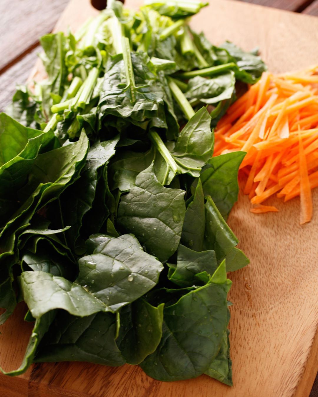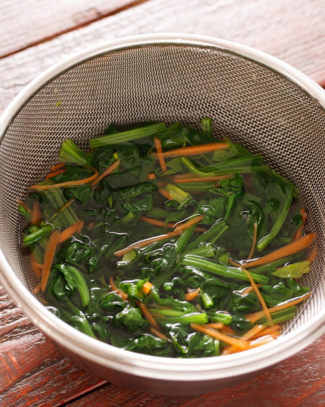 耐熱容器に、ほうれん草→にんじんの順に重ね、ふんわりラップをする。電子レンジ600wで約4分加熱し、冷水にとって水気を絞る。