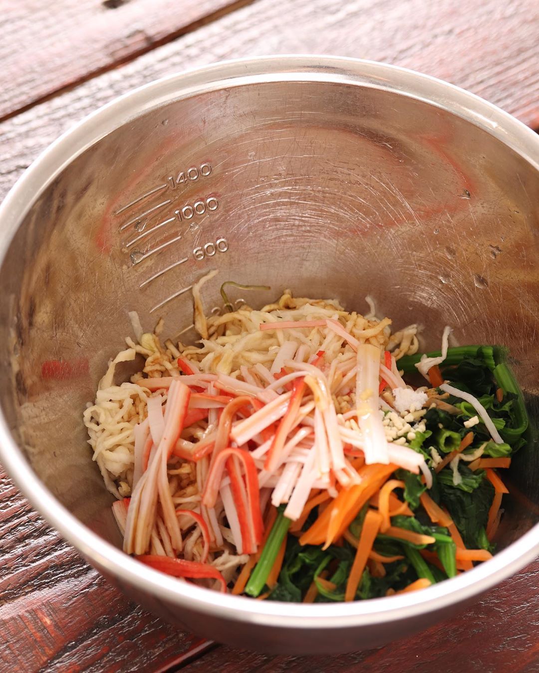 ✔️【カニカマ】➡︎ ロースハム2枚・ちりめんじゃこ10g・しらす20g・ツナ缶・油揚げ・蒸し鶏でも!