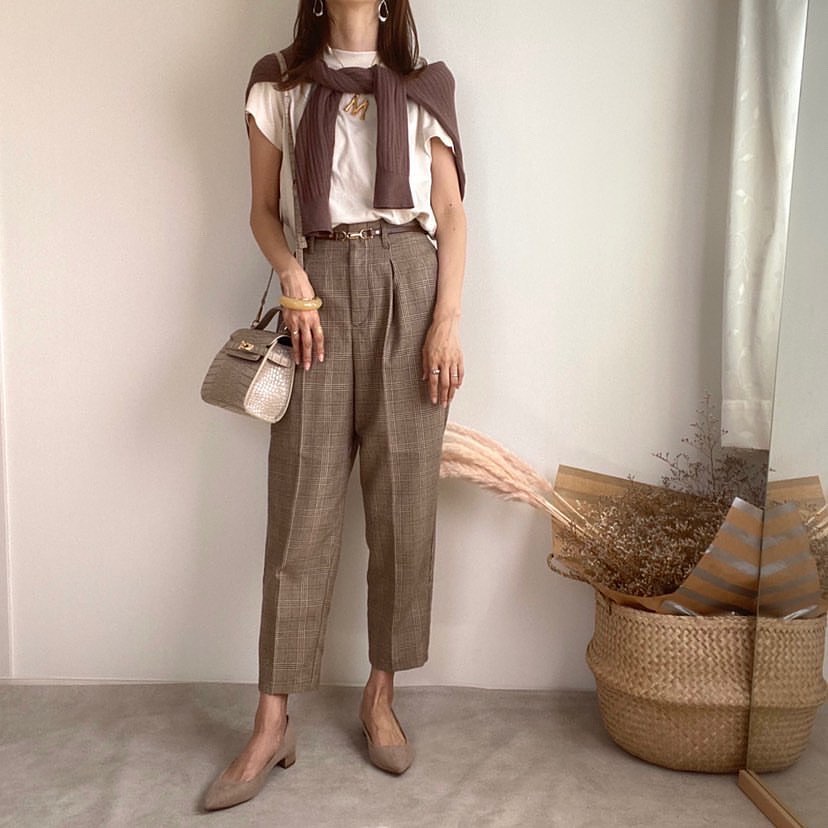秋に映えるチェックが可愛いテーパードパンツ✨テーパードシルエットが、品よくまとまってGOOD👍ブラウンでまとめたスタイリングが、流石ですね👏リラックスしているのに、良い感じが保てる優秀ボトムス😘イチオシです🙌