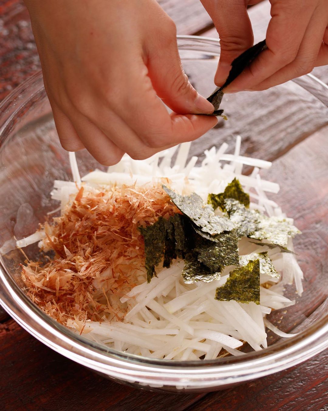 2のボウルに1・かつお節・手でちぎった韓国海苔を加えて、サッと混ぜ合わせる。