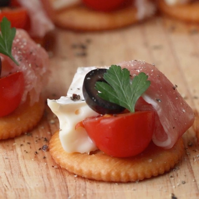 2.クラッカーに(1)、ブラックオリーブをのせる。