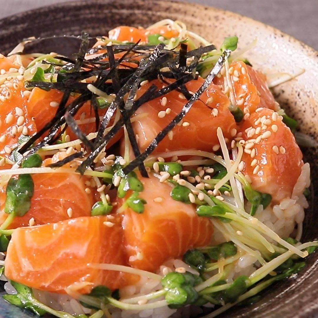 わさびとかいわれ大根のぴりっとした辛さが効いた、ちょっと大人のどんぶりレシピです。かいわれ大根のシャキシャキとした食感もアクセントになります。シンプルながらもサーモンのおいしさを存分に味わえる一品です。ぜひ作ってみてくださいね。