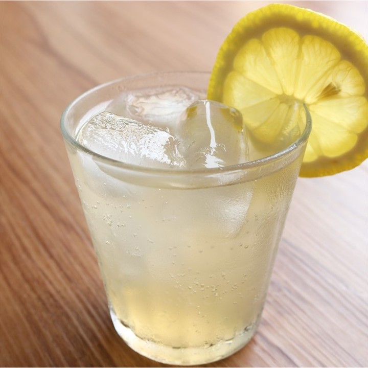 4. グラスに3と炭酸水を1:3の割合で注ぎ、レモンをのせて完成です。