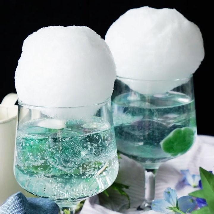 8. 型から外したらグラスにゼリーをいれて綿あめをのせてサイダーをかける。⠀