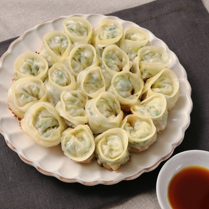 ひと手間でジューシー餃子の紹介です。捏ねる時に鶏ガラスープを染み込ませることで、ジューシーに仕上がります。パリパリの羽根がおいしい一品で、おかずにもおつまみにもぴったりですよ。ぜひ作ってみてくださいね。