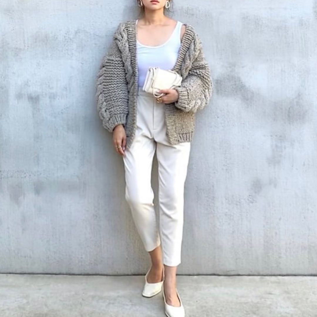 ライトコーデュロイタックテーパードパンツコーデをPick up!着こなしやすい薄手コーデュロイで、もたつかないスタイリングを実現✨タックテーパードが、ちょうどいいシルエットで綺麗ですね😍タンクトップにざっくりニットを羽織った、オシャレ映えの合わせ方もGOOD👍コーデュロイを主役にしたら、秋からその先まで、活躍間違いなしですね🙌