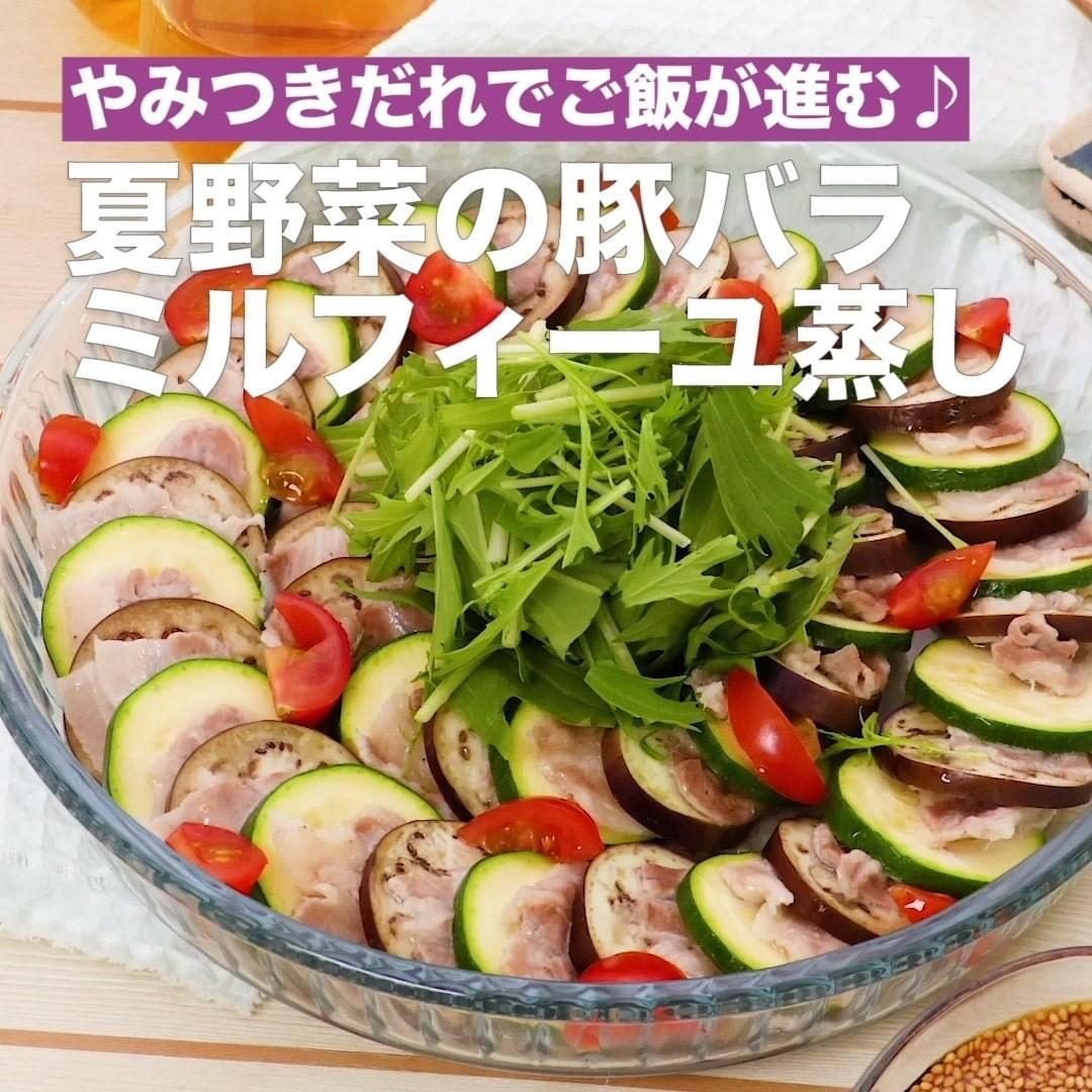 ⑤<やみつきだれでご飯が進む♪夏野菜の豚バラミルフィーユ蒸し>