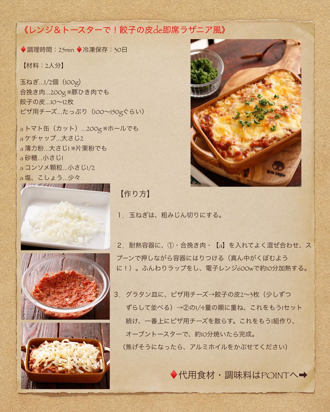 ③グラタン皿に、ピザ用チーズ→餃子の皮2〜3枚(少しずつずらして並べる)→②の1/4量の順に重ね、これをもう1セット続け、一番上にピザ用チーズを散らす。これをもう1組作り、オーブントースターで、約10分焼いたら完成(焦げそうになったら、アルミホイルをかぶせてください)。