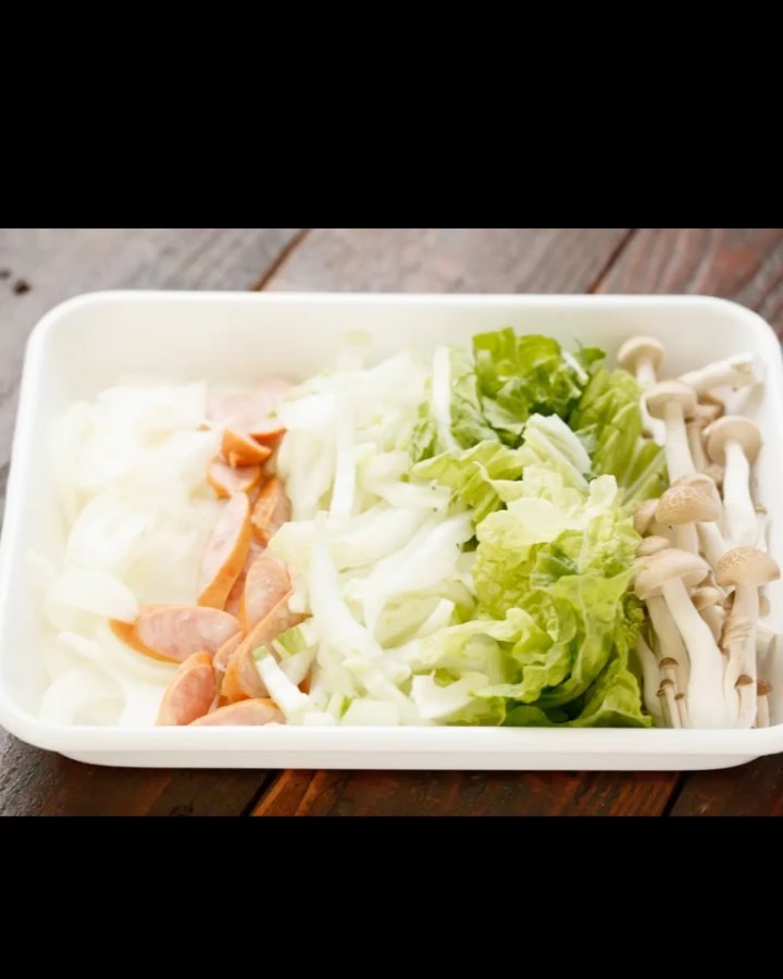 ①玉ねぎは薄切りにする。白菜は葉と芯に分け、葉は手でちぎり芯は細切りにする。しめじは石づきを取ってほぐし、ウインナーは斜め薄切りにする。
