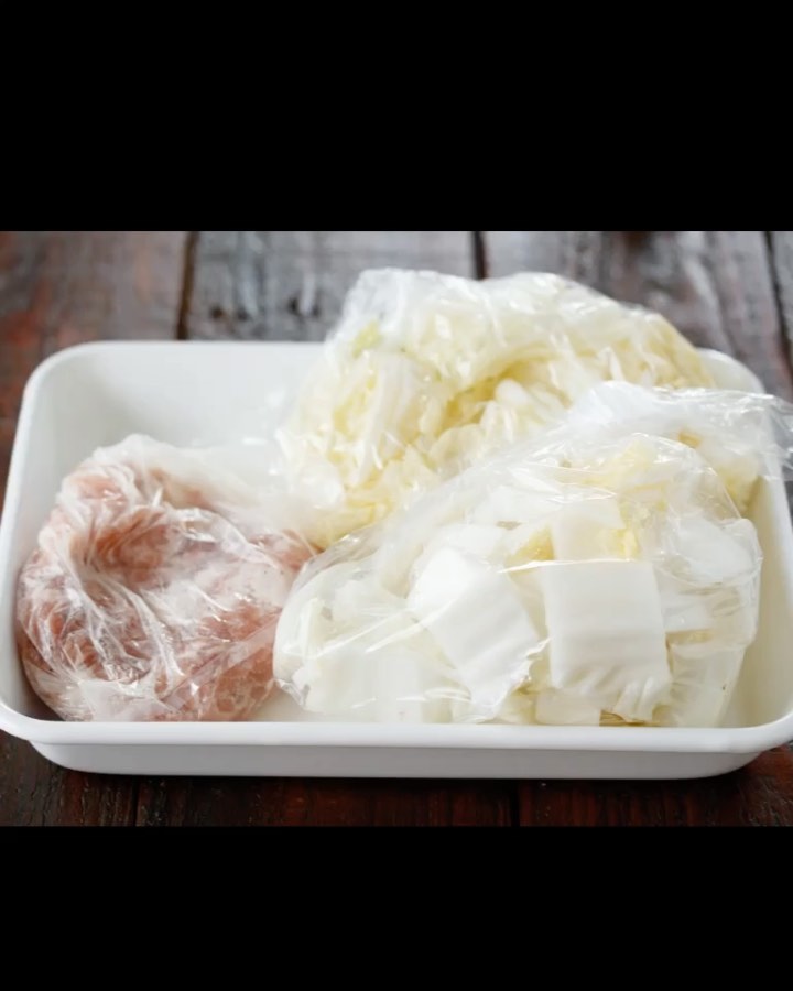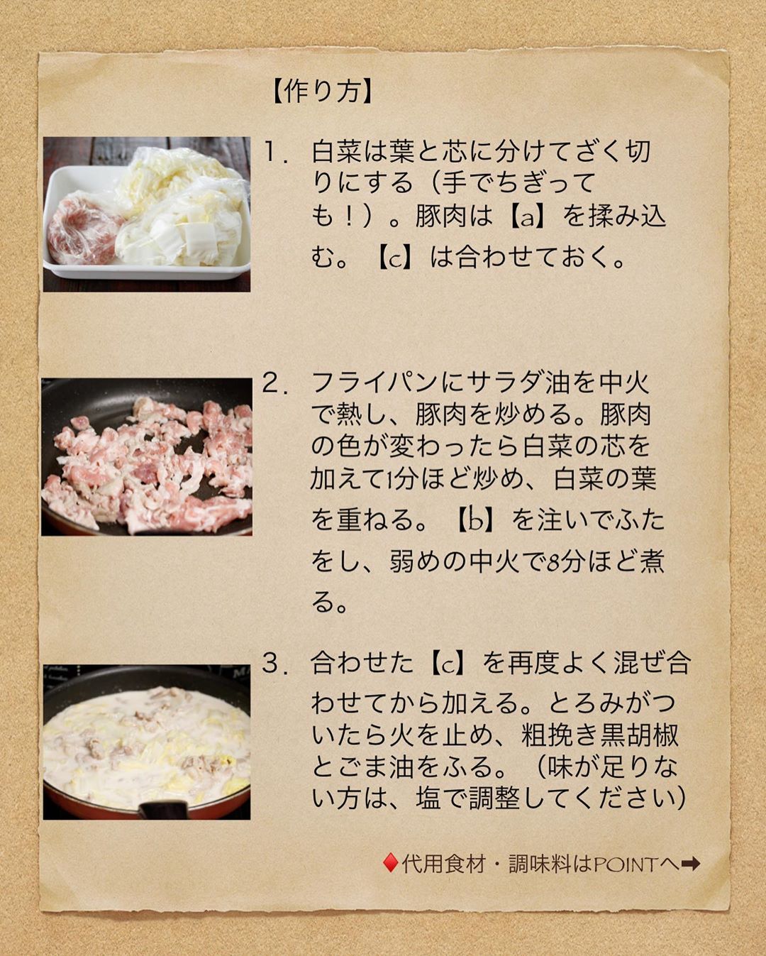 ①白菜は葉と芯に分けてざく切りにする(手でちぎっても!)。豚肉は【a】を揉み込む。【c】は合わせておく。