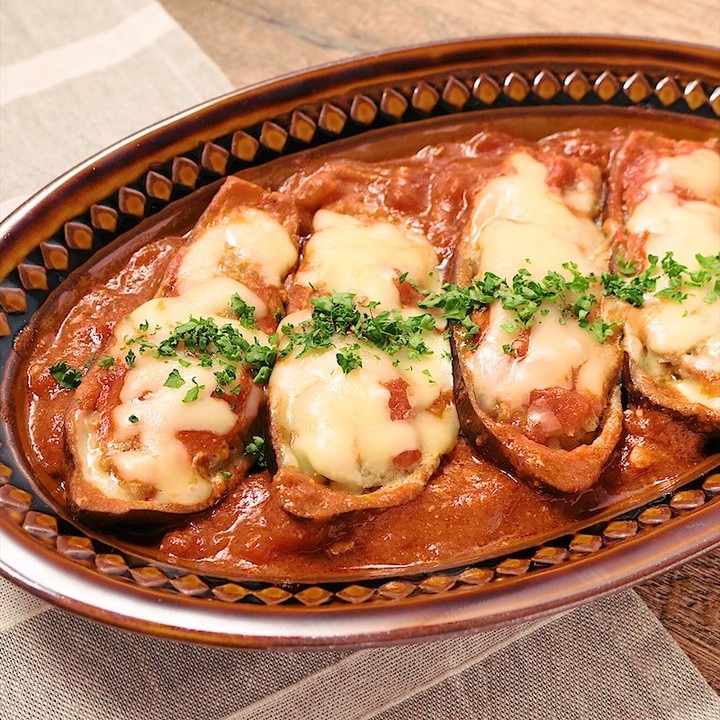 ナスの肉詰めはいかがでしょうか。ナスの皮に肉だねを詰めてトマトソースで煮込み、チーズをのせて仕上げました。くり抜いたナスの中身は、肉だねに混ぜ込んでいるので、無駄なく食べられます。ハンバーグのように形を整える手間が要らず、綺麗に仕上がりますよ。ぜひお試しくださいね