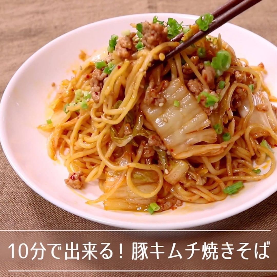 2. 豚ひき肉の色が変わったら1にキムチを加え、鶏ガラスープの素とめんつゆを加え中火で炒め合わせます。