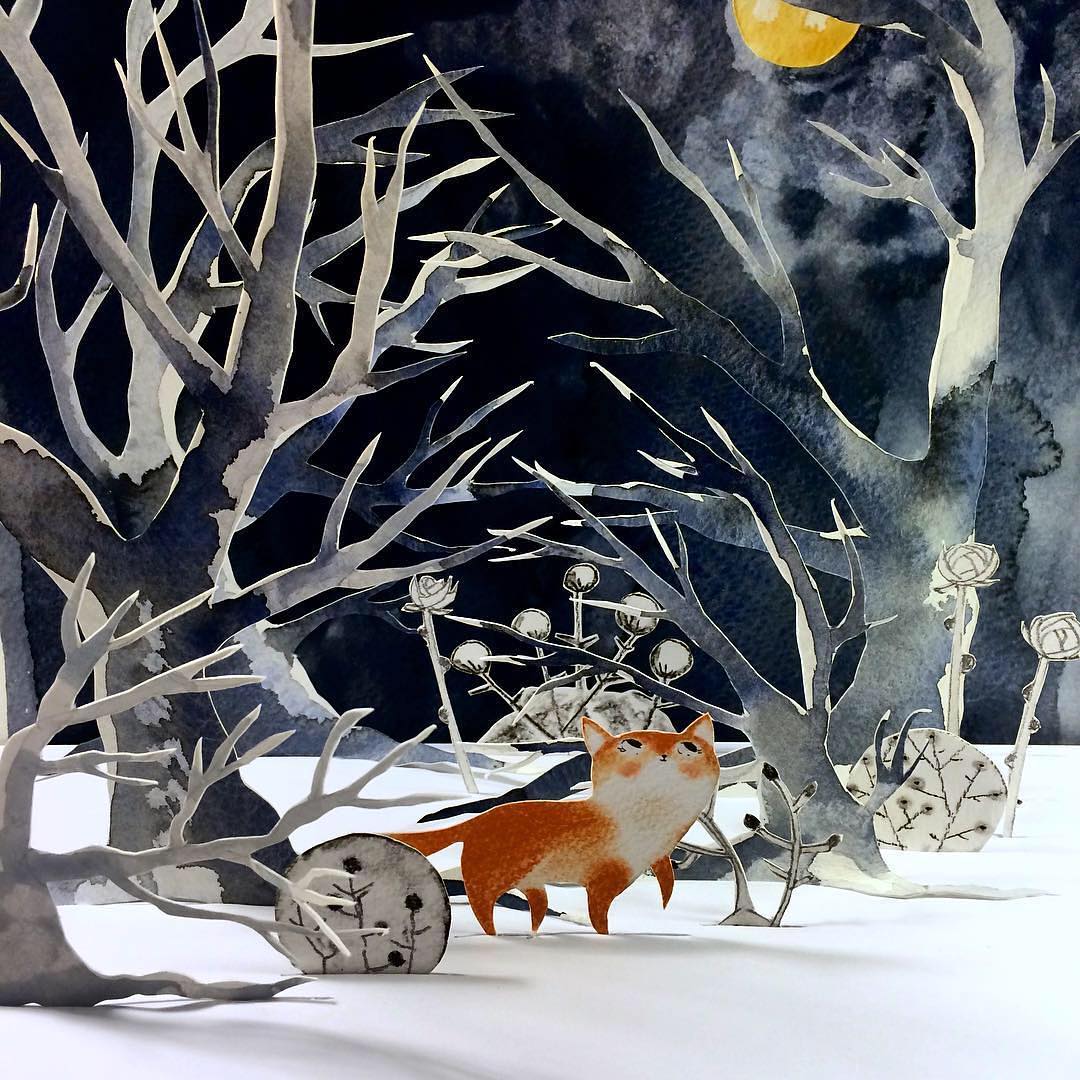 カナダ・ブリティッシュコロンビア州を拠点に活動するアーティストKelly Pousette (@kpousetteillustration) さんにとって、冬はいつでも心躍る季節だ。「夏には見られない複雑さや繊細さがあって、雪に覆われたカナダの風景はなんとも言えない美しさです」子どもの頃から絵を描くのが好きで、それが長じてシャドーボックスと呼ばれる奥行きのあるハンドクラフトの技法に行き着いた。人物や風景をフレームの中に立てて立体的な風景をつくる。「立てた人物や風景が影をつくるので、光の角度や絵の置き方を変えるだけで全く異なる世界を楽しむことができるんです」自然豊かなバンクーバーで生まれ育ったことで、たくさんの時間を野外で過ごすことに恵まれ、そのことが今でも彼女の想像力の源泉になっているという。お気に入りの動物はキツネで、彼女の作品によく登場する。「屋外で過ごしたたくさんの時間があったからこそ、風景や動物たちが自然と心のなかに浮かぶんだと思います」