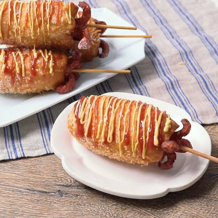 たこさんウインナーのハットグの紹介です。ハットグはとろーりチーズがおいしい、韓国式のアメリカンドッグのことです。グラニュー糖をまぶした、甘しょっぱい屋台フードです。たこさんウインナーがとっても可愛いですよ。
