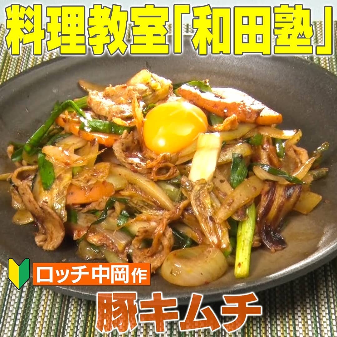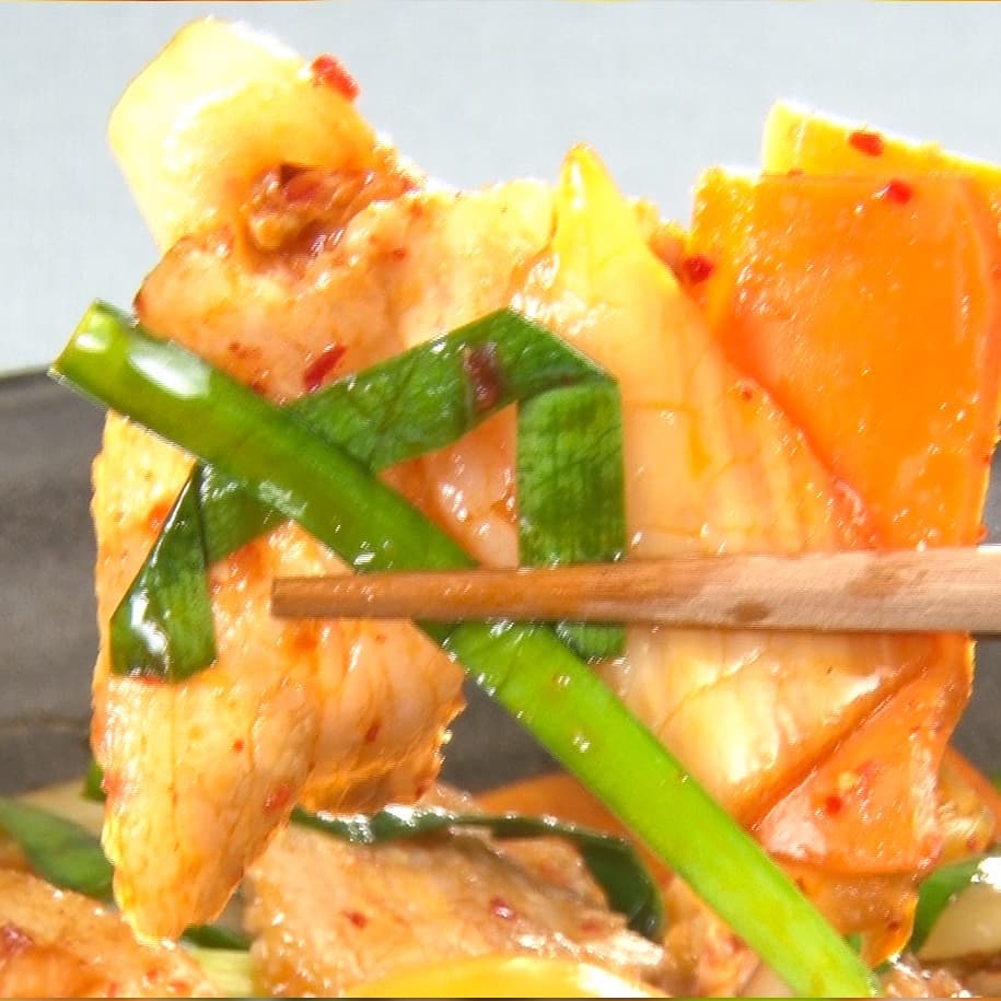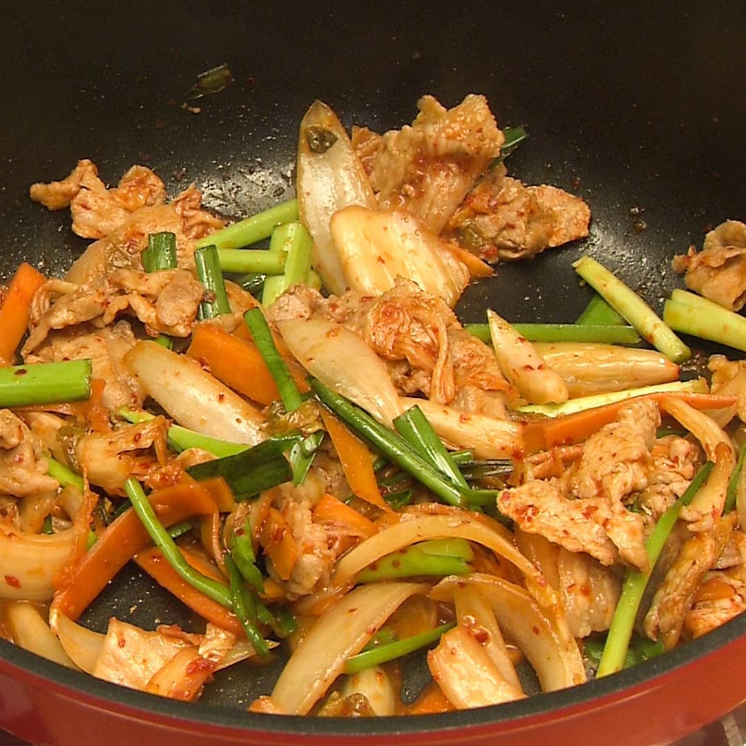 ⑤キムチ80gを汁ごと加え、汁と油が乳化するように炒める