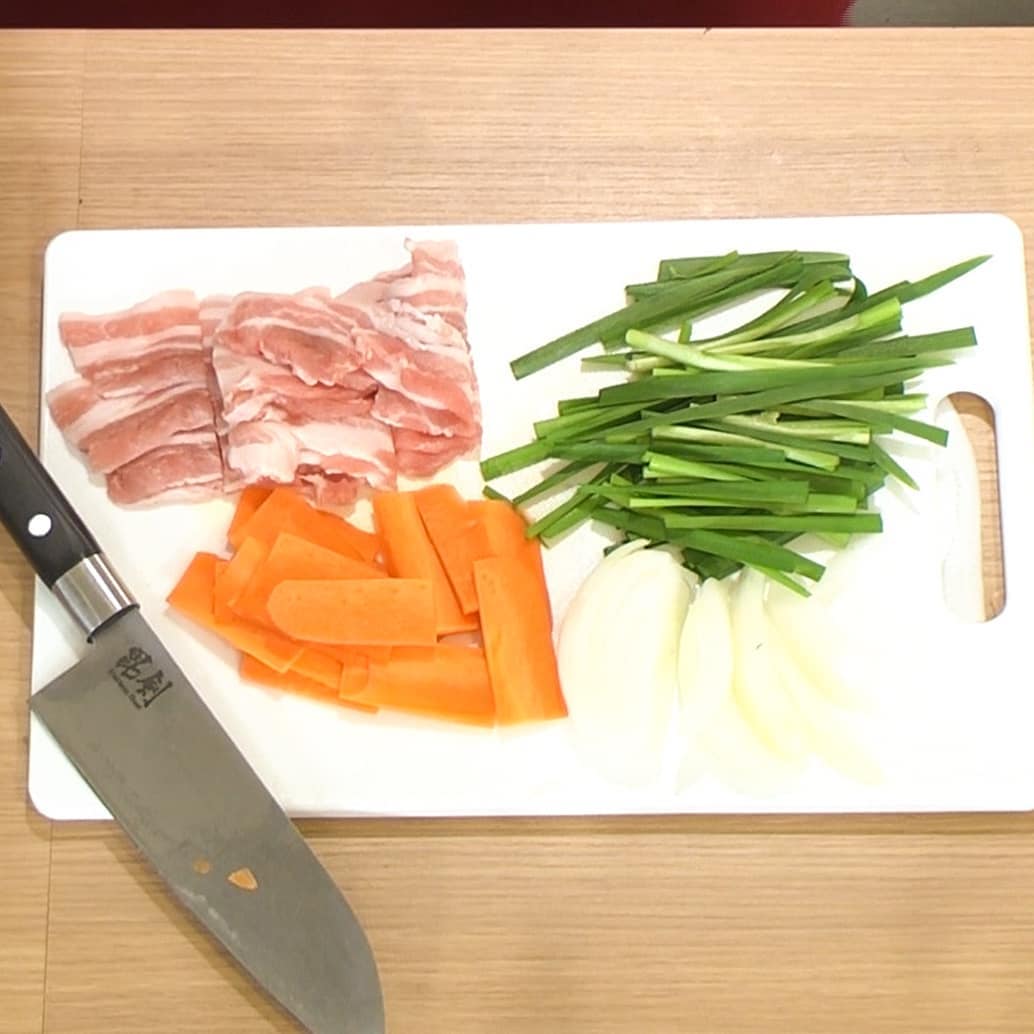 ②ニラ20gを4cmの長さに、豚バラ肉100gを一口大に切る