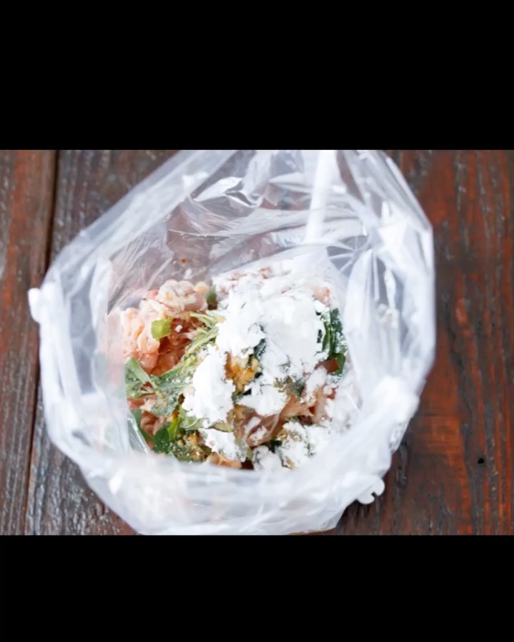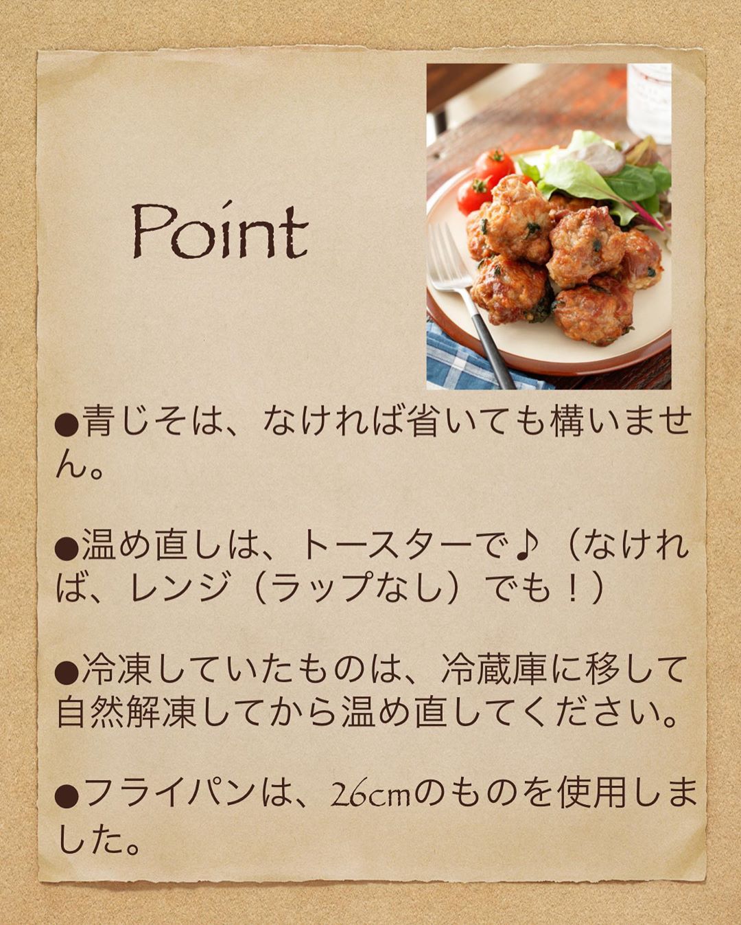 ①ポリ袋に豚肉・手でちぎった青じそ・【A】を入れてよく揉み込み、6〜7等分にして丸める。