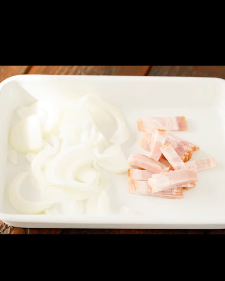 ①玉ねぎは薄切りに、ベーコンは短冊切りにする。
