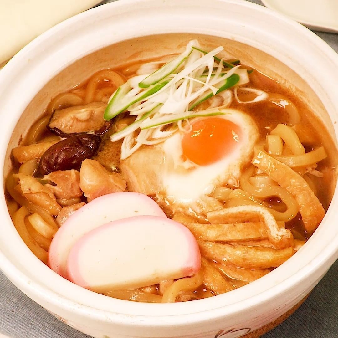 名古屋の名物みそ煮込みうどんをご家庭で作りやすいように再現♪しっかり味が染みたうどんは絶品です。鶏もも肉やねぎ、しいたけが入って食べ応えもあります。半熟卵を絡めてお召し上がりください!