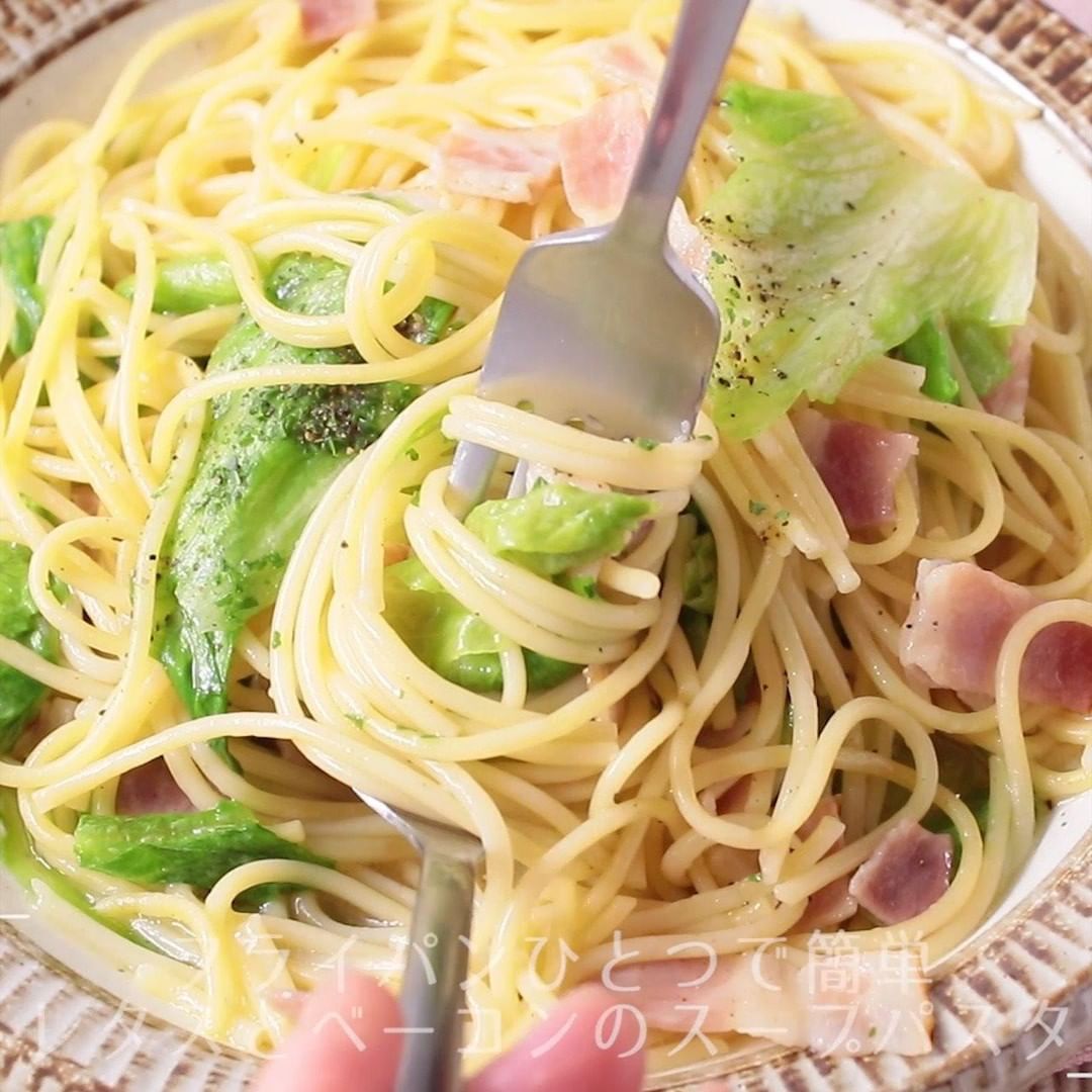 ①『フライパンひとつで簡単 レタスとベーコンのスープパスタ』