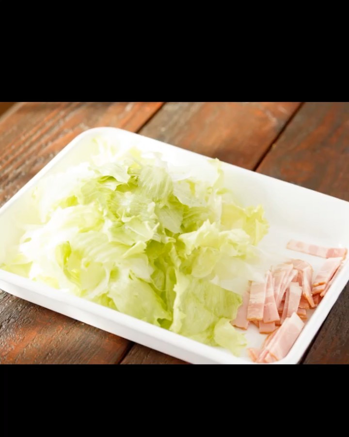 ①レタスは、手でちぎる。ベーコンは短冊切りにする。