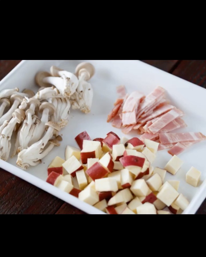 ①しめじは、石づきをとってほぐす。さつまいもは、小さめの角切りにして水にさらす。ベーコンは、短冊切りにする。