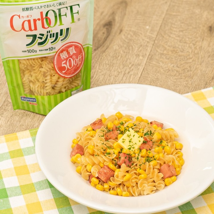 コーンとゴロゴロベーコンのバター醤油パスタのレシピのご紹介です。香ばしくゴロッとしたベーコンと、甘いシャキッとしたコーンをたっぷりを使用した満足感のある低糖質パスタです!「CarbOFF フジッリ」にバター醤油がよく絡みしっとりと仕上がります。ワンパンで作れますので、ぜひ試してみてくださいね!