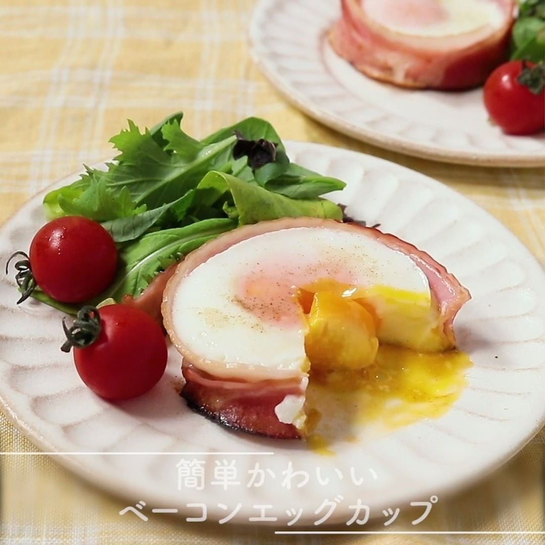 1. ベーコンを横長に半分に切り、4cm程ずらして重ね、円を作ります。同様にもう1個作ります。