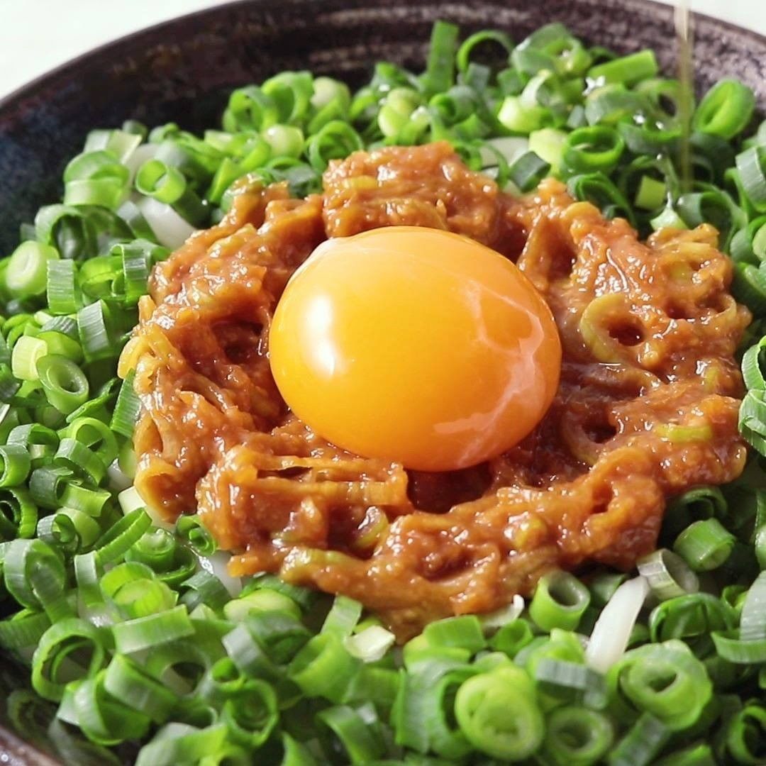 4. 器に3を入れ、中央に2を乗せます。回りに小ねぎを敷き詰め、卵黄を乗せてごま油を回しかけたら完成です。
