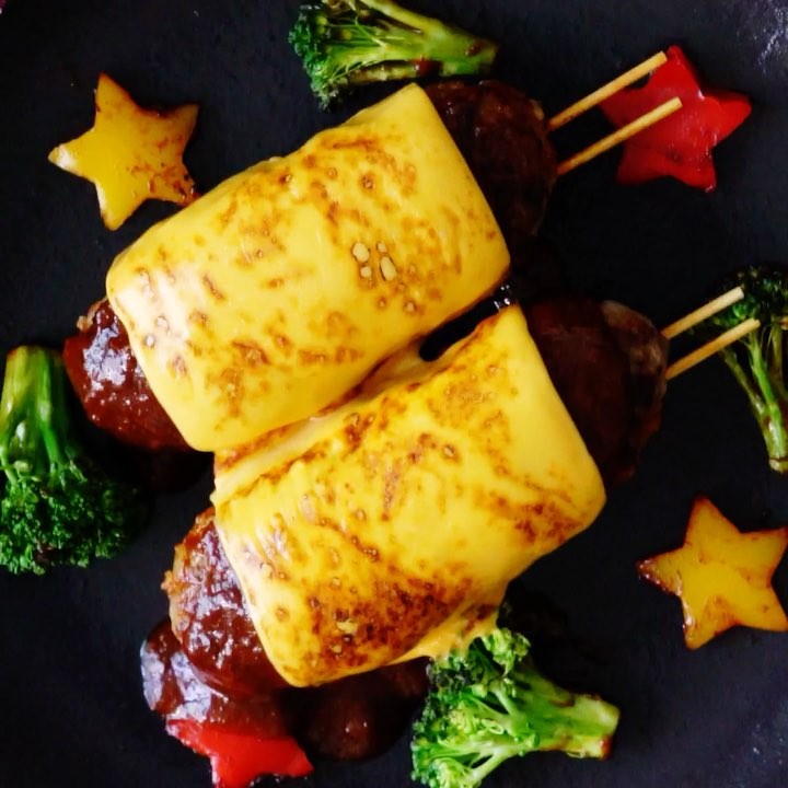 3. 形成したらフライパンにのせ、表面を焼き、デミグラスソース、小房に切ったブロッコリーと星形にくり抜いたパプリカをのせ、蓋を閉める。中火で10分弱加熱する。⠀