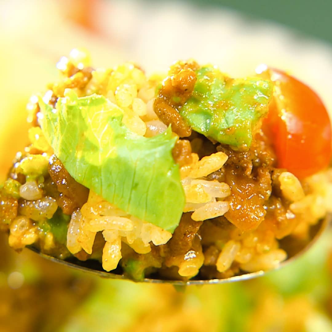 ④皿にご飯、タコミート、千切りにしたレタス、カットしたプチトマトを映えるように盛り付ける。