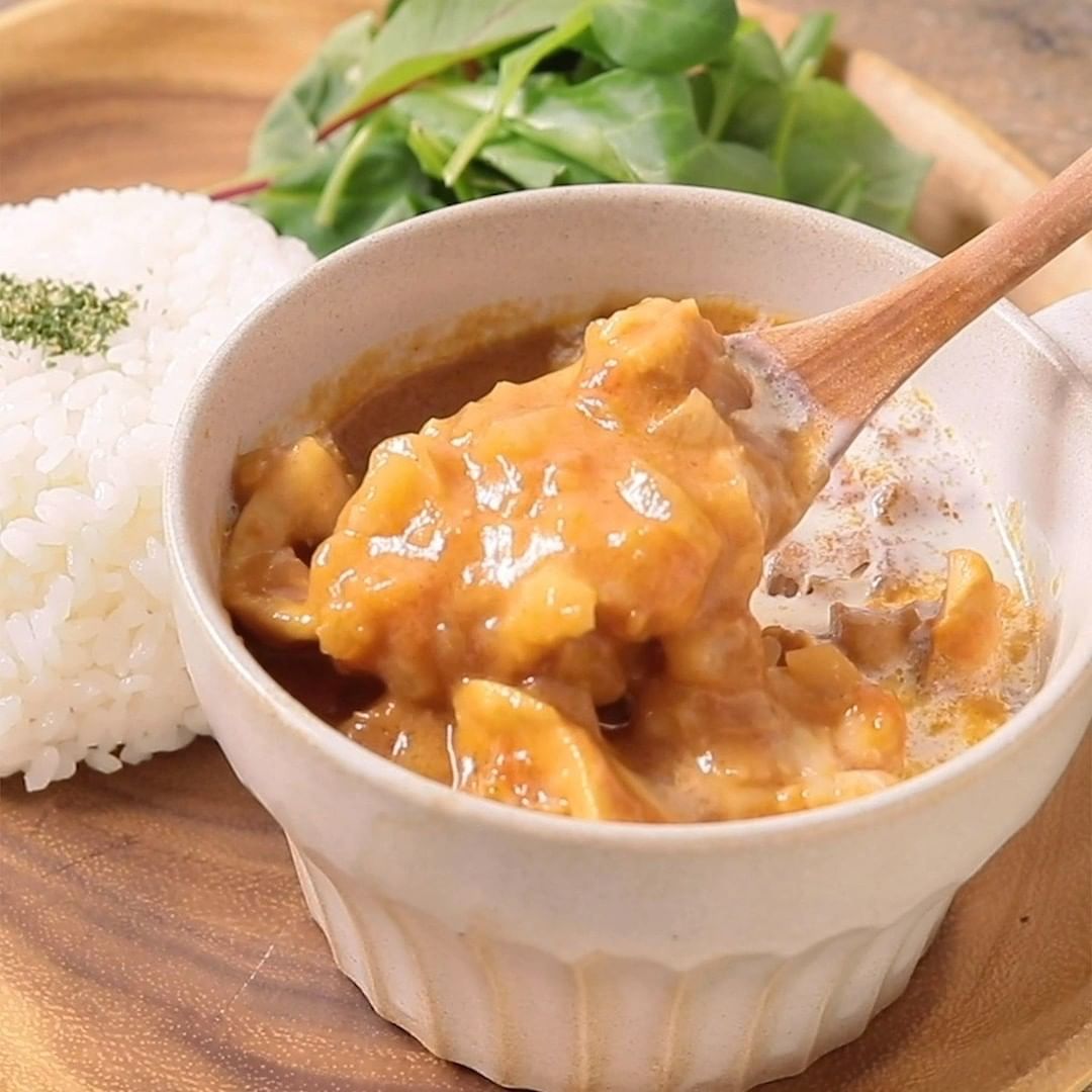 4. ②を入れ、カレールーが溶けるまで混ぜ合わせたら牛乳を入れ混ぜ、ラップをかけ温まるまで600Wの電子レンジで5分加熱します。