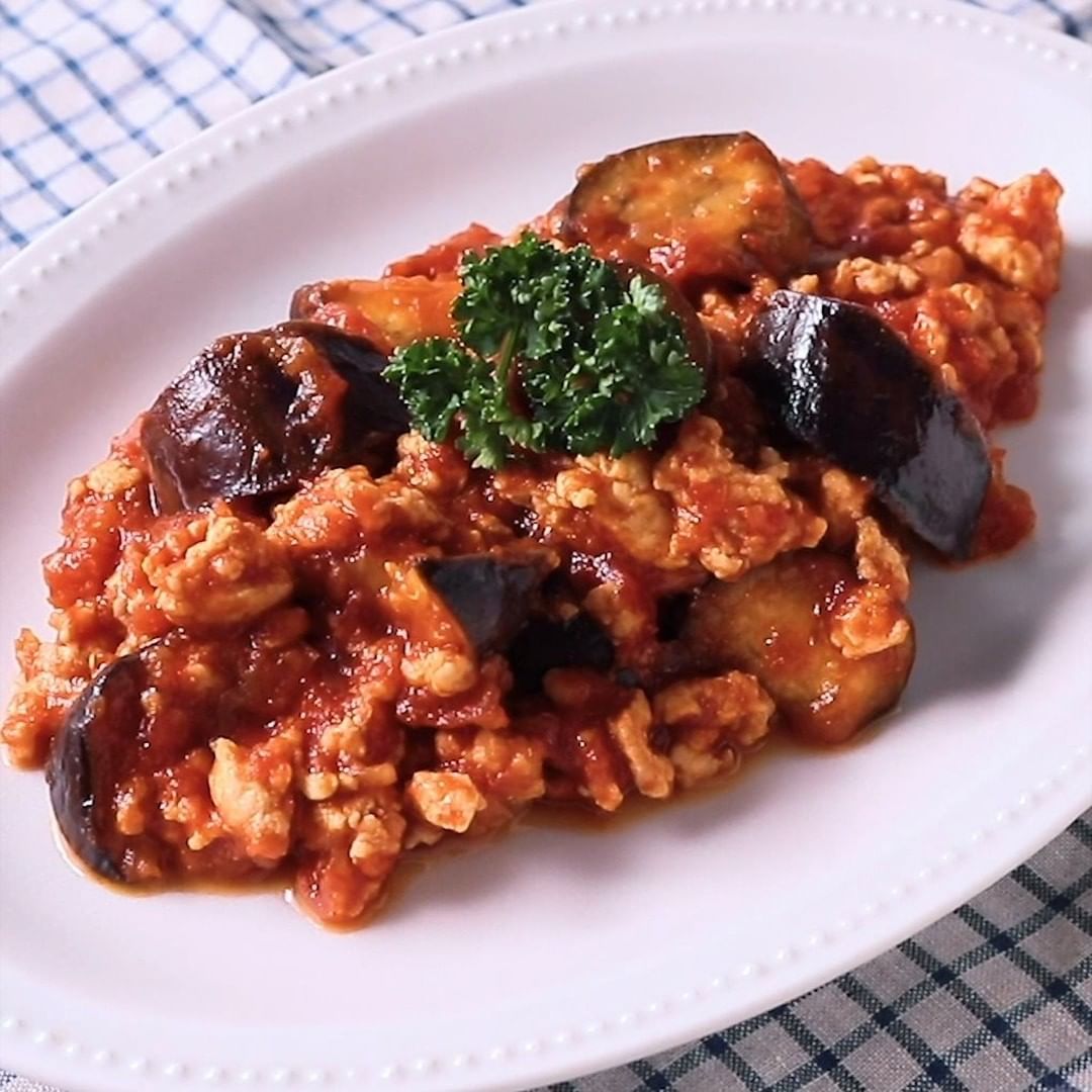 5. カットトマト缶、①を入れ全体に味がなじむように混ぜ、ひと煮立ちしたら、弱火にし、蓋をして鶏もも肉に火が通るまで10分程度煮ます。