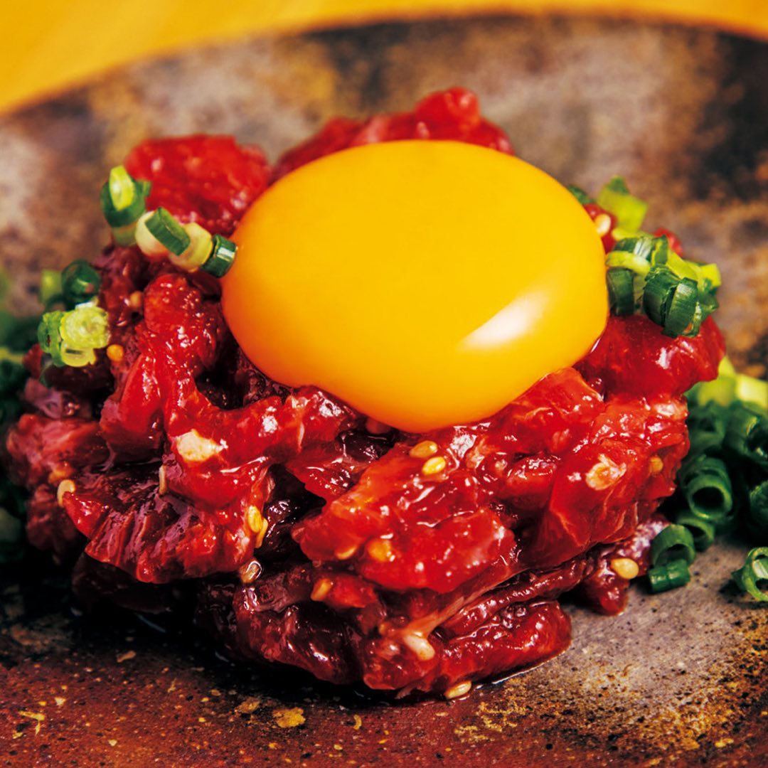 ①「まぐろユッケ」はまぐろの赤身のみを使用