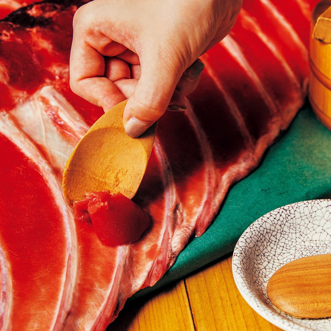 ④まぐろのすき身が骨付きで運ばれてくる、迫力満点の「まぐろ中落ち」。