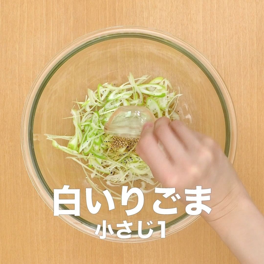 (1)ねぎは縦半分に切り、斜め薄切りにする。ボウルにねぎ、☆を入れて混ぜる(ねぎ塩だれ)。(あとで具材を入れるので、大き目のボウルで混ぜましょう。)