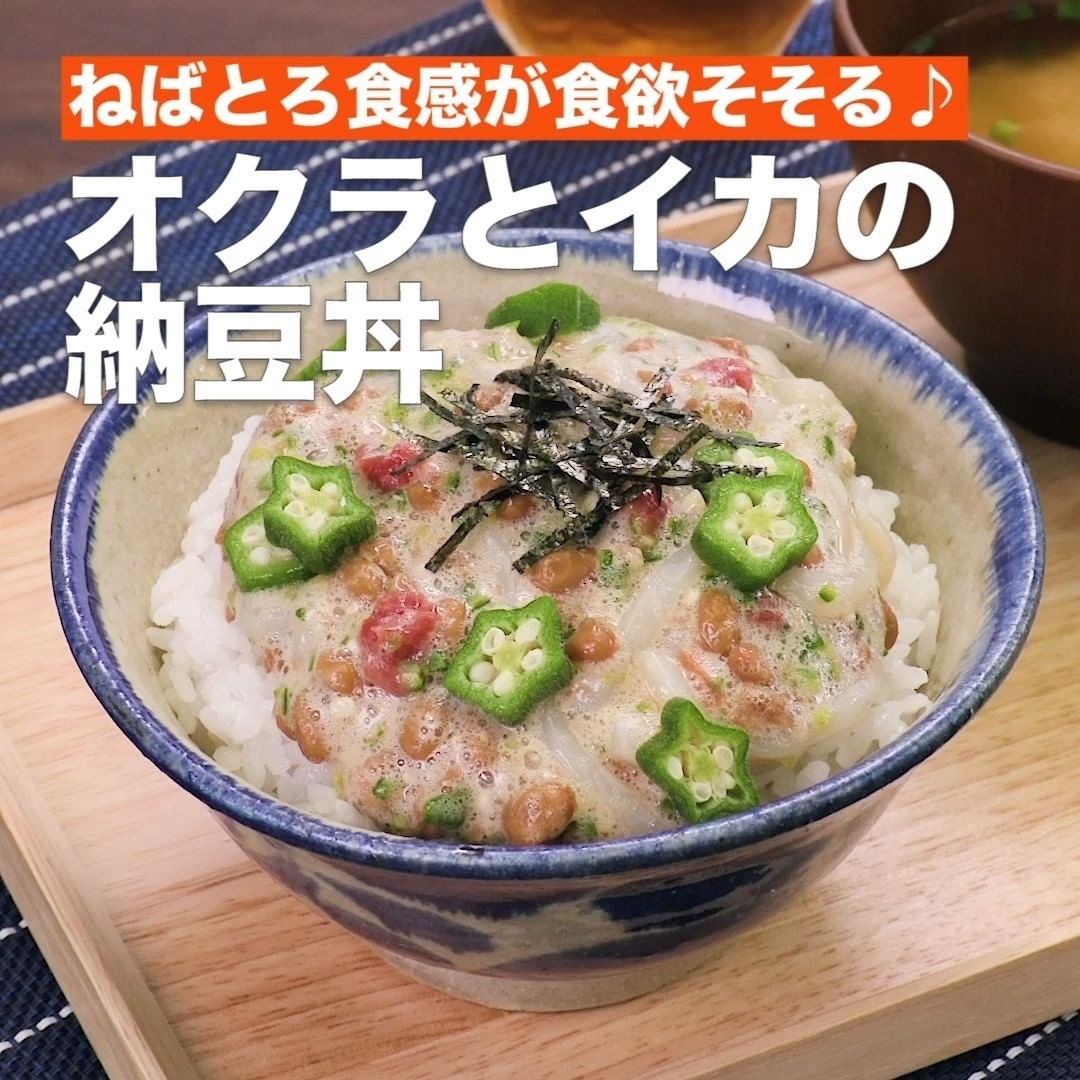 ⑦<ねばとろ食感が食欲そそる♪オクラとイカの納豆丼>