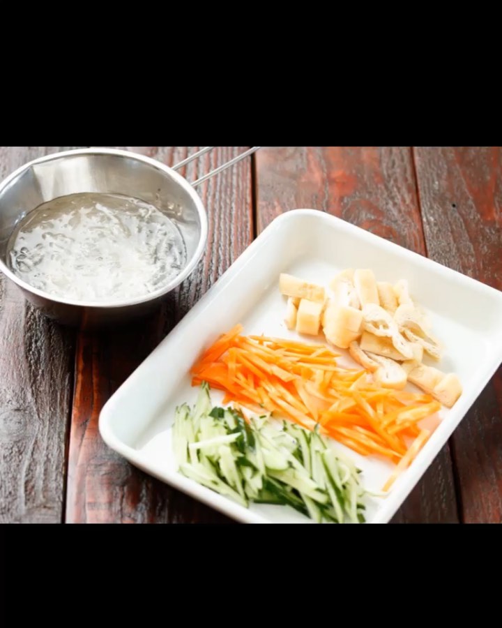 ①油揚げは、ペーパータオルで余分な油を抑え短冊切りにする。にんじんときゅうりは千切りに、糸寒天はたっぷりの水で戻す(10分ほど)。