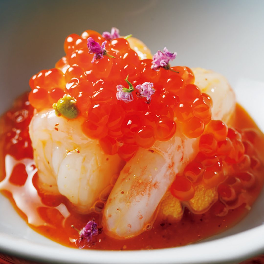 ①「雲丹、牡丹海老、実山椒の酢漬け」はおつまみの1品。残ったソースにシャリを足してくれるのが心にくい