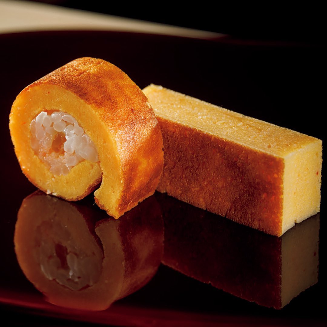 ③〆は伝統的な玉子焼きと、厚さを変えた玉子焼きでシャリと海老のおぼろを巻いたもの