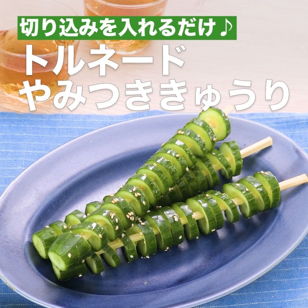 ごま油の風味がたまらない、見た目にも楽しいやみつききゅうりレシピをご紹介!等間隔に切り込みを入れるときれいなトルネードになります。おつまみやおやつにもおすすめです♪