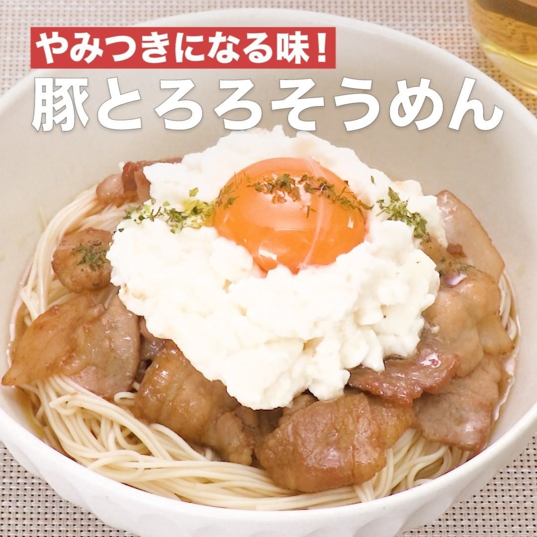 甘辛く炒めた豚肉ととろろをそうめんに絡めていただきます。卵と豚肉のコクのある味わいが癖になります。とろろとそうめんのつるつるとしたのどごしでさらっと食べられるボリューム満点レシピです!