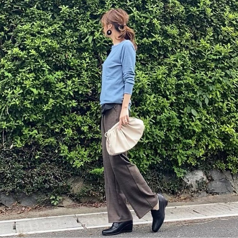 上品なチェック柄と、大人なストレートラインでキマるスラックス✨程よい落ち感が、絶妙でとっても素敵🥰くすみブルーとの相性も、抜群ですね👌秋映え狙うなら、このボトムス🙌
