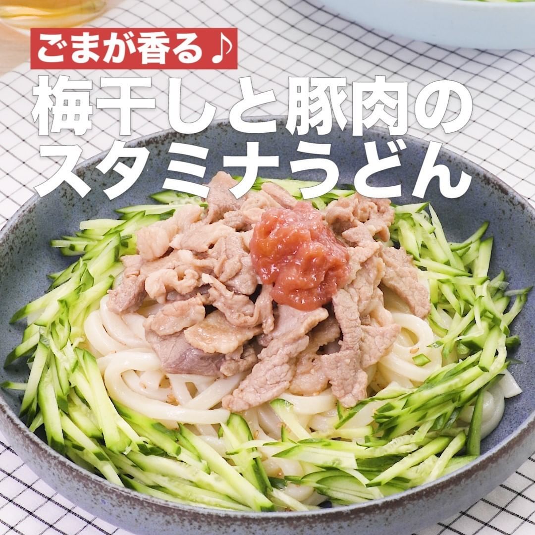 豚肉とにんにくを炒めることでパンチの効いた味になり、うどんとの相性抜群♪梅干しの酸味、きゅうりの食感がアクセントになります!よく混ぜてお召し上がりください。