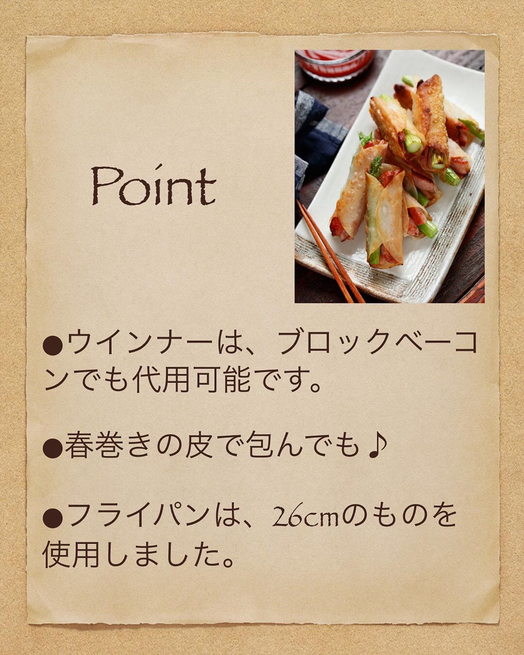 ②餃子の皮1枚に、佐賀県産アスパラガス1本とウインナー2〜3本を乗せて巻く。巻き終わりは、皮の淵に水を塗って止める。残り14個も同様に作る。