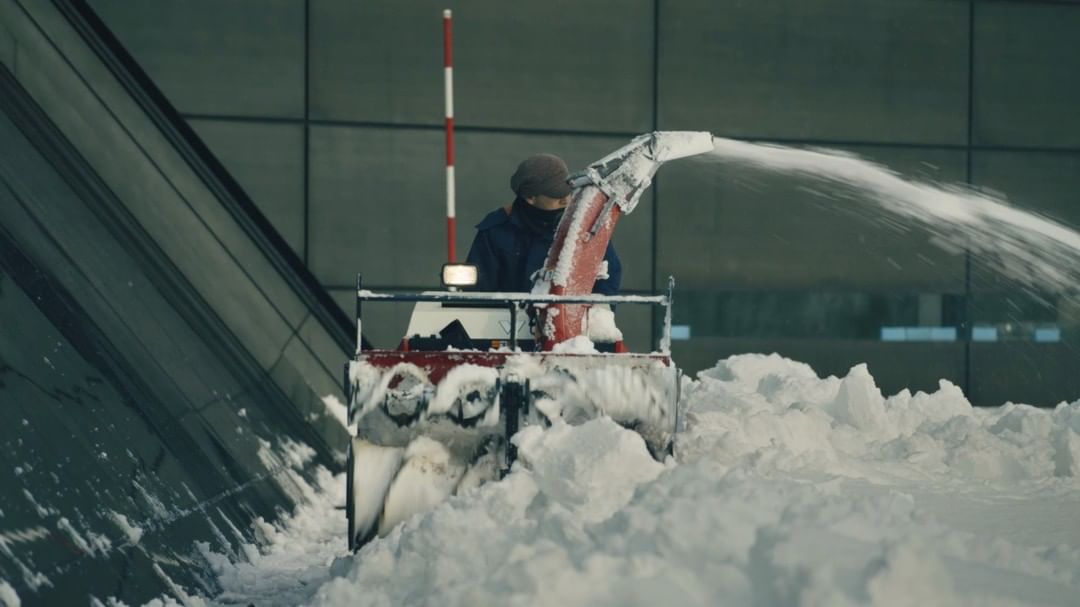 公園にある施設の斜面状の外壁に積もった雪をスコップでかいていき、その後、除雪車が走る。