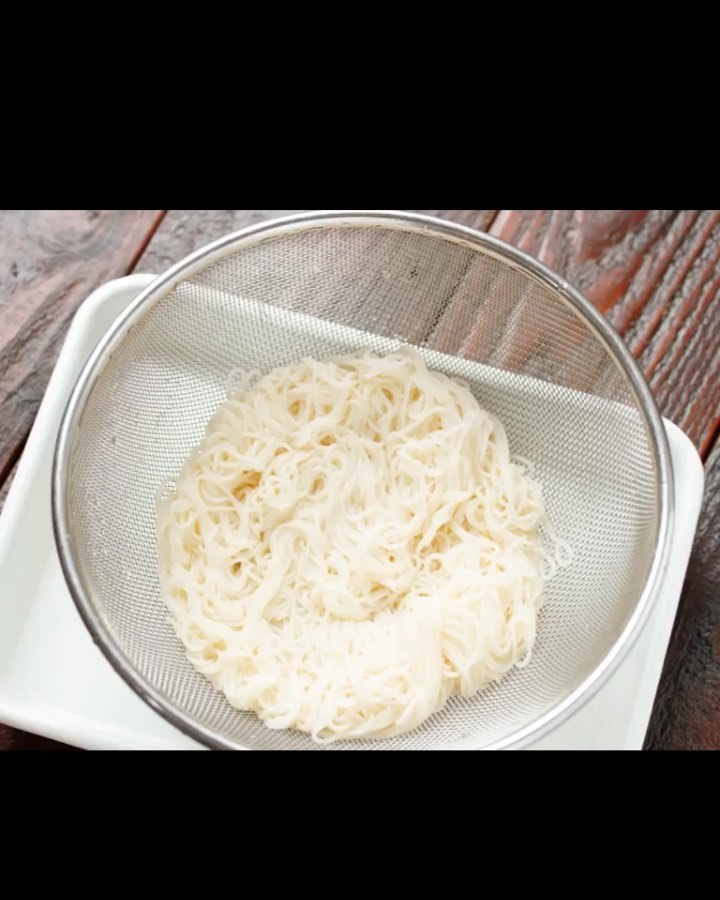 ①そうめんは、袋の表示通り茹で、冷水でしめる。
