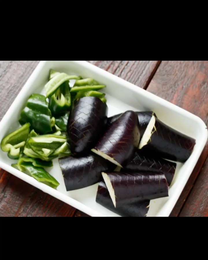 ①なすは格子状に浅い切り込みを入れ、食べやすい長さに切る。ピーマンは種とヘタを取り、一口大の乱切りにする。