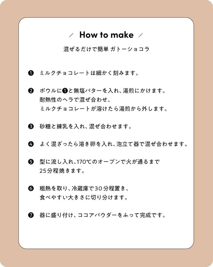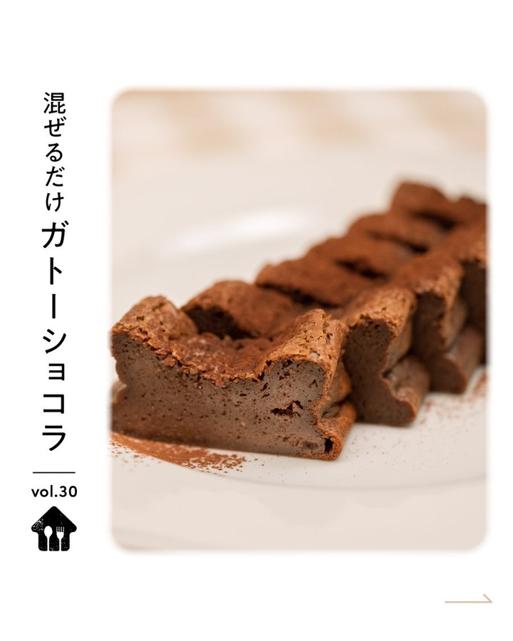 #おうち時間 におすすめ☕️🌱 混ぜて焼くだけで簡単に作れる、ガトーショコラのご紹介です。 薄力粉を使わないタイプで、焼くと一度膨らみますが、冷めるとしっとりとした食感です。